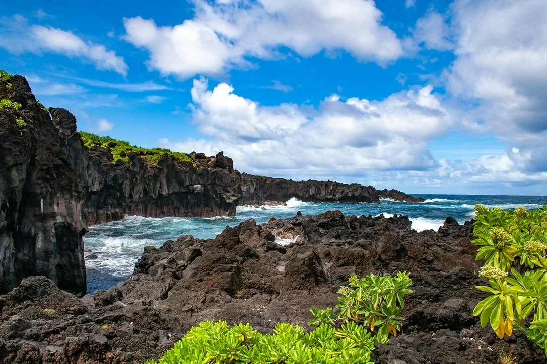The magnificent beauty of the tropical coast of Hana and it's intense power have a way of opening your senses that nothing else can match. Turquoise water and white waves lace together as they embrace the black sand beach at mystical Pailoa Bay. The contrast of colors and textures that fill your consciousness take you to a new level of experience. Walking along paths, surreal in their beauty, your senses will be filled with the sights and sounds of the Islands and your heart with the feeling of Aloha.